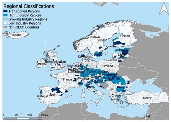The cases of interest were selected from among member countries of the Organization for Economic Cooperation and Development (OECD)—so-called ‘advanced economies’. This study identified 130 sub-regional territories (TL3) across OECD countries where there has been a high share of employment in industry (more than a quarter out of total employment), which has subsequently declined in the past decade (timeframe 1999–2019). The data for this analysis was accessed from the OECD regional database (https://stats.oecd.org, accessed on 1 September 2021). Employment in industry (under ISIC Rev 4, B-5) includes the following: (A) mining and quarrying (B), manufacturing (C), electricity, gas and conditioning supply (D), water supply, sewerage, waste management and remediation activities, construction (F). Sub-regions were sorted according to the following four types (see Figure 1, Figure 2 and Figure 3 below):