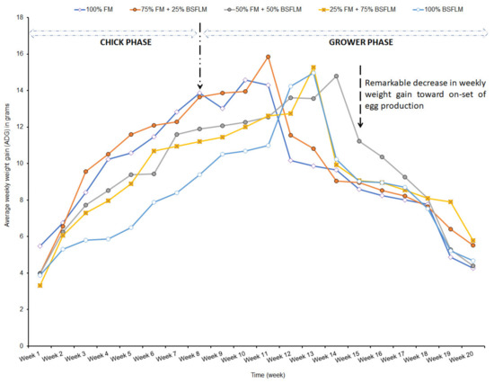 During the transition phase of the birds from the chicks to the growers (i.e., between week 10 and 12), there was a period of physical adjustment to the new feeds between week 10 and 12. Leeson and Summers [79] and Mwaniki et al. [21] revealed that birds are usually physically challenged before the onset of egg laying with great potential for negative nutrient balances to occur. This explains why young birds must be provided with adequate energy and nutrient-rich feeds for proper body build up before the onset of egg laying. This may be due to the growth of the digestive system of the grower birds, which is capable of handling more fibrous materials that might have originated from the increased inclusion of BSFLM. Mwaniki et al. [21] emphasized that despite the weight gain at the end of the growing phase of the birds, it is imperative that the feed intake of the birds should be increased as the peak egg laying period approaches.