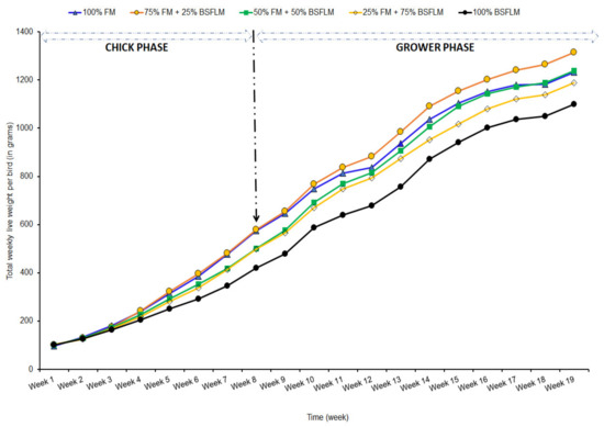 Total weekly live weight per chick and grower pullets fed on the various diets throughout the experiment. Diet 1: 100%FM + 0%BSFLM; Diet 2: 75%FM + 25%BSFLM; Diet 3: 50%BSFLM + 50%FM; Diet 4: 75%BSFLM + 25%FM and Diet 5: 100% BSFLM + 0%FM.