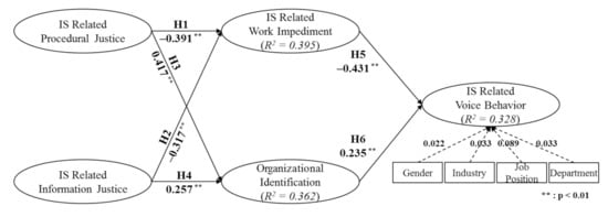 IS-related work impediment is a factor that negatively affects IS compliance behavior. Bulgurcu et al. [], who applied the rational selection theory to the field of IS, stated that the additional work process and action demands arising from the introduction of security policies result in individual organizational identification. It is a factor that assesses IS in terms of cost; furthermore, it is considered to harm the intention of compliance. Hwang et al. [] suggested the cause of personal security noncompliance, and it was confirmed that the organizational identification of an individual caused by the introduction of IS policy and technology is a condition that reduces the intention to comply with IS. Therefore, IS-related organizational identification is judged to harm voice behavior, an action concept that actively presents opinions to achieve organizational goals, as well as individual IS compliance behaviors. We present the same research hypothesis.