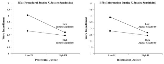 Individuals faced with the situation of judging IS-related organizational justice have different influences and attitudes towards justice according to their own level of sensitivity. Gollwitzer et al. [] researched IS-related organizational justice and justice sensitivity that influence the violation of organizational rules and confirmed that damage sensitivity did not increase the violation behavior in the early stage. In other words, because damage sensitivity is the level of sensitivity of individuals who judge that they should be treated appropriately when they perform an action required by the organization, it reduces the violating behavior when the organization judges that the result is fair. In addition, Schmitt et al. [] confirmed the influence of justice sensitivity and the formation of attitudes toward the organization and society. Victim sensitivity is strongly accepted when the organization performs fair activities, trusting and defining the organization and its members. We have confirmed that it helps us judge that it is good. In other words, justice sensitivity is the sensitivity of an individual’s evaluation of an organization’s fair activities, and high justice sensitivity is a controlling factor that strengthens the evaluation of the organization’s justice to have a positive or negative attitude []. In the field of IS as well, the reason for personal IS compliance of information justice, the concept of clearly providing information necessary for IS actions, and procedural justice, which is an evaluator who makes decisions that occur during the IS process and that all people have fair procedures. We judge that justice sensitivity will reinforce its positive or negative influence; thus, the following research hypotheses are proposed.