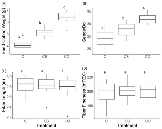 Boxplots comparing (A) seed-cotton weight (g), (B) number of seeds per boll, (C) fiber length (in), and (D) fiber fineness (mTEX) between three hand pollination treatments: closed (C), closed self-cross (CS), closed outcross (CO). Closed (C) flowers remained bagged with lightweight white organza bags throughout the flowering period, closed self-cross flowers (CS) were bagged but supplemented with self-cross pollen, and closed outcross (CO) flowers were bagged but received outcross pollen from three to five donor flowers in the vicinity. The central bar gives treatment mean, boxes indicate the 1st and 3rd quartiles, and closed circles show outliers.