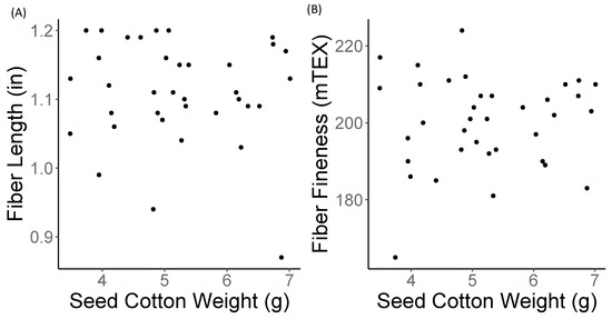 Correlation plots showing the lack of relationship between (A) seed-cotton weight (g) and fiber length (in) and (B) seed-cotton weight (g) and fiber fineness (mTEX).