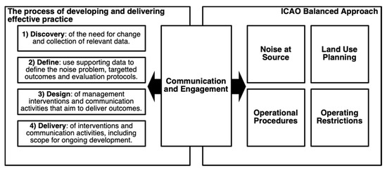 To increase the likelihood of noise management interventions being successful, it seems important that airports engage with citizens more effectively, throughout the entire process of developing and delivering an intervention. Research conducted in the ANIMA project [41] suggested that such a process could take airports from the identification of the need for change, through the design of appropriate interventions, the selection of the most appropriate option, its implementation, and its continued and ongoing evaluation. Similar processes are advocated for in the wider field of design and have been advocated for in regard to noise management previously [66], including through national guidance [67,68]. By engaging with stakeholders throughout this process, airports can ensure noise challenges are effectively understood and articulated, and that interventions that aim to address them can be developed and implemented in ways that are more likely to be deemed acceptable by all stakeholders. In short, the effectiveness of noise management interventions (including defining what effectiveness looks like) can potentially be enhanced when the need for interventions, their development, and their targeted outcomes are discussed and agreed with by their recipient communities. Importantly, incorporating resident perspectives in this way can also help to residents to feel empowered and with some sense of control over the noise that they are exposed to, which can further help to address perceptions of both the noise source and the management measure itself [25,32]. As such, the present authors believe that communication and engagement sits across all Balanced Approach interventions, as well as being a potential intervention in its own right, and that it should be considered throughout the process of developing and delivering noise management interventions (see Figure 2).