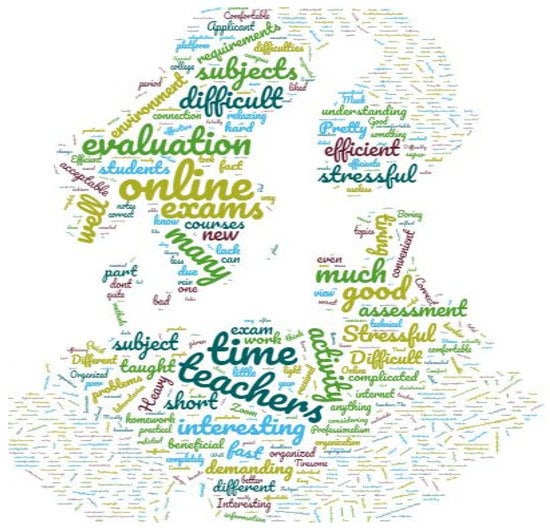 The most common words, highlighted in the cloud are as follows: Online—26 times; time—23 times; teachers—19 times; evaluations—14 times; exams—14 times; many—13 times; good—12 times; much—12 times; activity—11 times; difficult—11 times; subjects—11 times; well—11 times; interesting—10 times; stressful—9 times; evaluation—8 times; effective—8 times (Figure 1), etc.