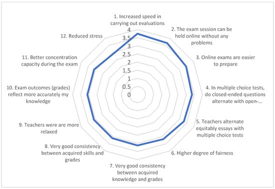 The results are rather positive. A single parameter, the stress felt in the exam (m = 2.93) displays an average below the middle of the scale. It shows that, even in the online environment, the end-term exams trigger, in addition to the value of assessment as such, stress due to the fear of failure or of an unwanted qualification (grade). For the rest of the parameters, the obtained results are above the average of the scale, i.e., higher speed in the conduct of evaluations (m = 3.75); the exam session can be held online without problems (m = 3.66); and the exams in the online version are easier to prepare (m = 3.46). When using multiple choice tests there is an alternation of closed-ended questions and open-ended questions (m = 3.36); teachers alternate equitably essays with multiple choice tests (m = 3.30); greater accuracy (m = 3.17); very good consistency between obtained grades and acquired knowledge (m = 3.13); very good consistency between obtained grades and acquired skills (m = 3.10); teachers were more relaxed (m = 3.10); exam results more accurately reflect my knowledge (m = 3.09); and better concentration during exams (m = 3.09). These scores indicate that the respondents positively appraise the assessment carried out during the evaluated period, considering online assessment to be good, with a tendency to be evaluated as very good.