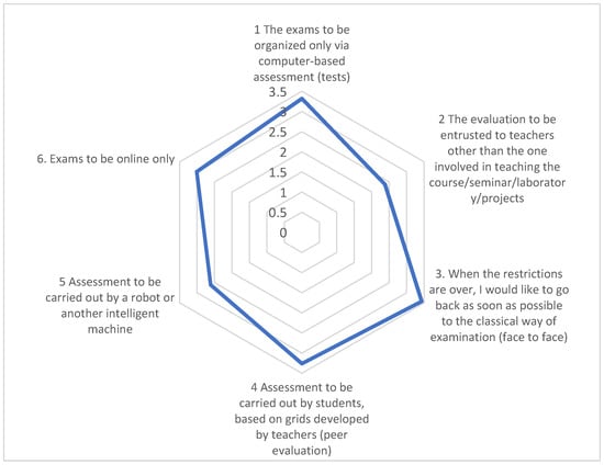 Finally, to determine student appraisal on future trends in evaluation/assessment, based on their experiences during the COVID-19 pandemic (RO4), students were asked a question with several possible variants of evaluation development. In descending order (according to Table 8) the results are as follows: Return to the classical method of examination—m = 3.53; evaluation in examinations to be carried out only by computer tests—m = 3.32; assessment to be carried out by students on the basis of scales developed by teachers—m = 3.26; evaluation in exams to be carried out only online—m = 3.01; evaluation in examinations to be carried out by a teacher other than that of the course/seminar/laboratory/project—m = 2.38; and assessment to be carried out by a robot or any other intelligent machine—m = 2.61.