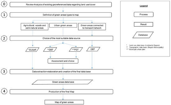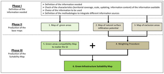 In relation to the green areas potentially available for infiltration (phase II, map 1 of Figure 1), we followed a specific procedure, which is shown in Figure 2.