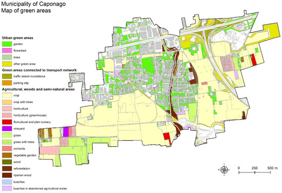 The DBT contains information with a greater level of detail in the urban context and includes, in addition to public green spaces, private areas. It contains green areas connected to the transport network (e.g., traffic islands, roundabouts). The DBT of Caponago has been updated to 2015.