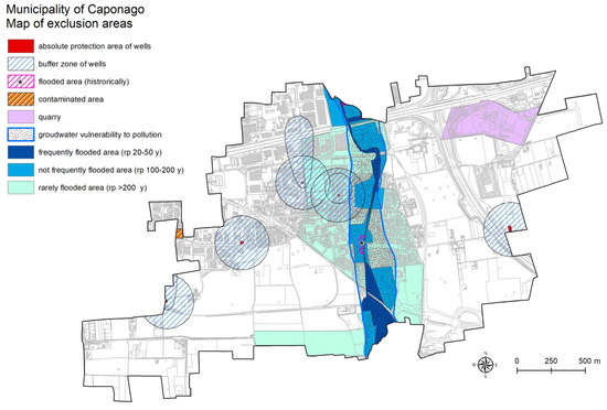 For this reason, a weight (ranging from 0 to 1) was assigned to each infiltration potential class and to each exclusion area (Table 7) in order to take into account the reduction of the compatibility, which could remain unchanged (weight = 1) or decrease to a minimum (weight = 0).