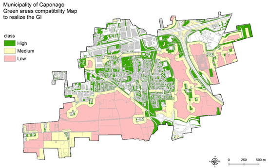 With regards to the areas compatible with the construction of GI, the green areas with high compatibility are close to urban areas and road networks (Figure 8) and represent 17.64% of the municipal territory and 26.22% of the total green areas. This means that about three-quarters of the permeable areas of the municipality have from medium to null compatibility with the construction of GI (Table 10).