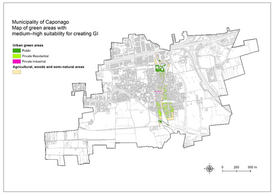 Only 27% of urban green areas with medium-high suitability for the construction of the GI are public areas. The remaining 73% is private, 68% residential and 5% industrial (Figure 10). Dhakal and Chevalier [24] reported a similar average percentage (65–75%) of private land in five American cities (Portland, Seattle, Philadelphia, Chicago, and Syracuse), noting that incentives and other programs offered to private landowners have produced encouraging results.