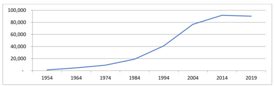 Progression in the number of golfers registered in Italy from 1954 to 2019. Source: authors’ processing based on FIG data [11].