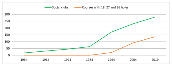Progression in the number of golf clubs and golf courses in Italy from 1954 to 2019. Source: authors’ processing based on FIG data [11].