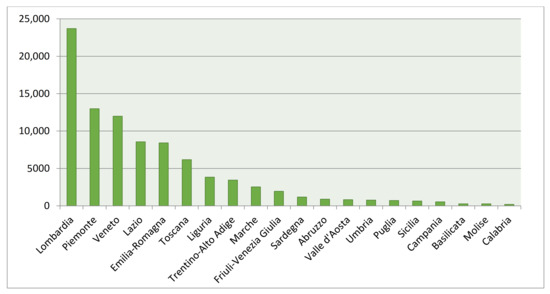 Distribution of golfers registered in the Italian regions in 2019. Source: authors’ processing based on FIG data [11].