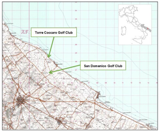 In Apulia, the San Domenico Golf Club obtained the GEO certification in 2019 and obtained the recognition of a club engaged in the conservation and protection of cultural heritage (a Messapian necropolis of the fifth century B.C. and a Masseria (large farm) of the eighteenth century) in 2017. The latter recognition was awarded in the same year to the Golf Club of Acaya (Caves of Basilian monks dating back to the fourth century AD) along with one for saving water consumption. There are also four Golf Clubs in Apulia that currently use macro-thermic species: Barialto di Bari, Acaya, Torre Coccaro and San Domenico. The latter two clubs, which are the subject of this discussion, both belong to an area known as the “productive agricultural park” and the “agricultural area of environmental protection” (Figure 4).
