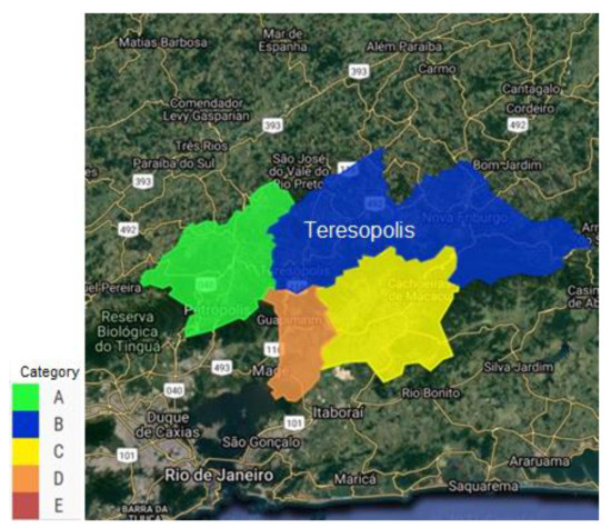 The thematic cartography (Figure 8), made from the touristic performance of the municipalities of the State of Rio de Janeiro, gives us, through the different colours, the information that the State of Rio de Janeiro consists of 57 municipalities in category A, 179 in category B, 539 in category C and 1961 in category D. Only one municipality belongs to category E. In this taxonomy, Teresópolis falls under category B. This hierarchisation tool improves tourism management, optimizes the distribution of resources and promotes the development of the sector.