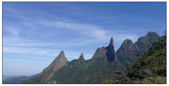 Serra Dos Orgaos, photographed from the Vista Soberba viewpoint, Teresópolis. Starting from the left mountaintops: Escalavrado, Dedo de Nossa Senhora, Dedo de deus e Cabeça de Peixe. Photo: under the care of the authors.