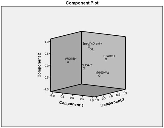 Factor analysis indicated that the variability among the present inbred lines is mainly contributed by protein and starch concentrations, followed by 100-kernel wt. (Table 3). These three components were extracted based upon principal component analysis, which showed that these alone contribute 68.58% towards kernel variability. The loading plot (Figure 1) revealed that protein, starch concentration, and 100-kernel wt. strongly influence the variability as their loading is close to 1.0. However, the variability does not affect sugar, oil, and specific gravity as their values are below 0.5, i.e., less than 1.0, and as we know, loadings close to −1 or 1 strongly influence the variable, and higher loadings either positively or negatively indicate that the particular variable has a strong effect on the principal component.