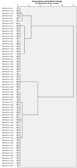 The genetic distance relationship of 63 maize inbred lines, depicted by the squared Euclidean distance based on Ward’s method of hierarchical clustering, was obtained based on nutrient composition (Figure 2) data. Cluster analysis was used to reveal the association between the inbred lines used in the present study. Cluster analysis provides various clustering algorithms such as “sequential hierarchical and neighbor clustering”. Due to the great heterogeneity within groups, hierarchical cluster analysis can be used to cluster maize inbred lines according to their differences and similarities to further investigate chemical compositional relationships between them. A total of two major clusters are formed at a distance of 25, having 26 and 37 inbred lines in cluster I and cluster II, respectively. On further reducing the distance to 9, three clusters were formed in which cluster I remained unaffected, while cluster II was split into two sub-clusters, viz., C II-SC 1 and C II-SC 2, having 7 and 30 maize inbred lines, respectively. On further reducing the distance to 6, cluster I was split into two sub-clusters, viz., C I-SC 1 and C I-SC 2, having 6 and 20 members, respectively. DMR WNC NY 397 and DMR WNC NY 404 are the farthest apart, having major differences in their protein, fat, starch, specific gravity, 100-kernel wt., and sugar concentration, followed by DMR WNC NY 2436 and DMR WNC NY 2394, DMR WNC NY 2212 and DMR WNC NY 2430, DMR WNC NY 396 and DMR WNC NY 2415, DMR WNC NY 404 and DMR WNC NY 2144, and DMR WNC NY403 and DMR WNC NY 2115. This variability can be exploited in crop improvement programs, particularly for grain quality traits.