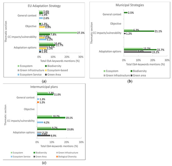 Percentage of total mentions for each EbA-keyword associated with the thematic sections identified in the documents, (a) EU´s adaptation strategy, Nkeywords = 77, (b) municipal strategies, Nkeywords = 759 and (c) intermunicipal plans, Nkeywords = 784. Only keywords with more than 1% representation.