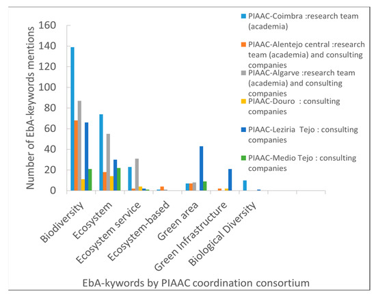 The intermunicipal plans (PIAACs) benefited from the experience acquired by the ClimAdapt.Local project. Its preparation was coordinated by a consortium made up of research teams (academia) and/or consulting companies, with emphasis on the greater number of mentions of the keyword “ecosystem service” in the plans prepared by consortia that integrate the research teams (Figure 5).