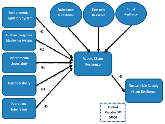 In Figure 1, theoretical framework is showing relationship among dependent and independent variables. In path 1, independent variables (environmental regulatory system, customer response monitoring system, environmental uncertainty, interoperability, and operational integration) shows impact on dependent variable (supply chain resilience) by forming hypothesis H1, H2, H3, H4, and H5. In path 2, supply chain resilience shows ultimate impact on dependent variable (sustainable supply chain resilience) by forming H6. Furthermore, environmental resilience, economic resilience, and social resilience are factors of supply chain resilience. In Figure 1, ISO 14000 is used as control variable in the current study.