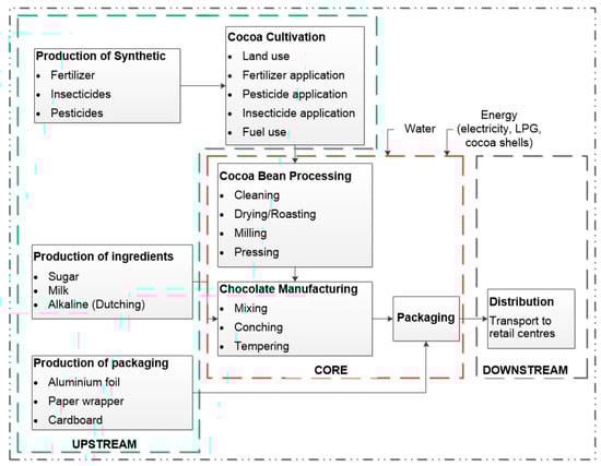 The system boundary encompasses the essential energy and material inputs/outputs that are related to the processes of producing chocolate. The defined functional unit, based on which the inventory data was normalized for assessing the impacts in this study, was 1 kg chocolate made from cocoa cultivated in Ghana and other ingredients. As shown in Figure 1, the system boundary covers both upstream and downstream processes including the following phases: