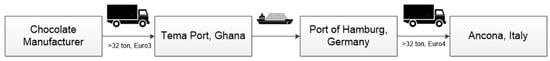 The first scenario examined was the impacts associated with different destination for 1 kg (10 × 100 g) packaged chocolate bars to different destinations. The major cities in Ghana such as Kumasi, Koforidua, and Takoradi were considered as the baseline destinations while Ancona, Italy was considered as a scenario for the export of the product. In the scenario for local destination, a transport-mean which was a truck with a load capacity >32 metric ton was selected, and the distances were estimated using Google maps. In the scenario for international destination, the distance from the company to Ghana port, and from there to the port to Hamburg and by road to Ancona in Italy is illustrated in Figure 2 below. The sea distances were also obtained from an online world seaports catalogue, marine, and port info website (http://ports.com/ (accessed on 18 February 2021)).