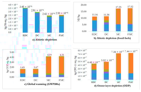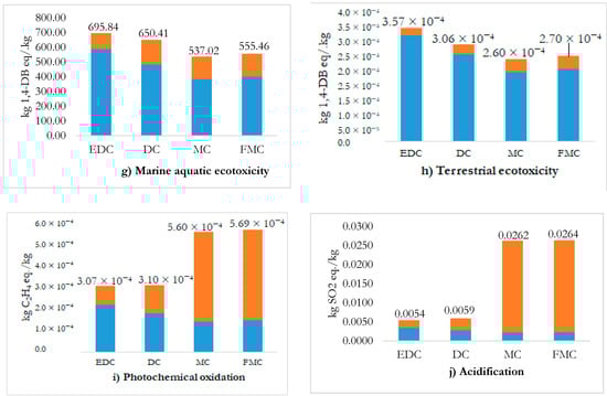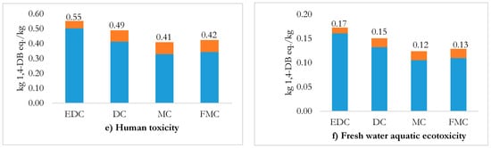 Environmental toxicity encompasses the toxic effects of chemicals on an ecosystem and is measured as three separate impact categories which examine freshwater, marine, and land. The emission of some substances, such as heavy metals, can have impacts on the ecosystem. From this study, a general trend was observed for FAETP, MAETP, and TETP. EDC comparatively had the highest values while MC recorded the least as shown in Figure 3f–h. Most of the impacts were associated with emissions from the CCP phase, contributing over 70% for all impact categories. Most impacting materials for FAETP and MAETP included pesticides, LPG (34–43%), (22–27%), and alkaline for Dutching (12–14%) for MC and EDC, respectively. Sugar also contributed 20% to the CM phase for MC and FMC. TETP was mainly influenced by emissions from pesticides (34–38%), Dutching (20–22%), and cleaning soap (18–20%). Ntiamoah and Afrane [9] reported higher values of 5.85 kg (1,4-DB) eq. and 7.12 × 10−3 kg (1,4-DB) eq. for FAETP and TETP, respectively. Konstansas et al. [17], also reported for 1 kg of moulded milk chocolate; 1.33 × 10−1 kg 1,4-DB, 1.21 × 10−1 kg 1,4-DB, and 3.1 × 10−2 kg 1,4-DB eq. for FAETP, MAETP, and TETP, respectively.