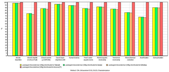 From the results obtained, the impact scores for 65 g packaged chocolate strips were highest across all impact categories while 100 g packaged chocolate bar and 300 g packaged chocolate pouch were relatively identical as shown in Table 8. The differences are mainly due to the amount of packaging materials used and the different primary package typologies; 65 g packaging recorded the highest scores due to the comparatively higher amount of paper used for secondary packaging. Chocolate is a typical confectionary product with a longer shelf-life, and thus exposure to air and light can result in loss of taste and flavour and loss of surface gloss [17,22]. Carton boxes are used as tertiary packaging for distant transportation of chocolate. The GWP results obtained in this study which range between 0.20 kgCO2 eq. and 0.39 kgCO2 eq. are comparable to values of 0.20 kg CO2 eq., 0.34 kg CO2 eq., 0.81 kg CO2 eq., and 1.91 kgCO2 eq. per kg chocolate bar (FU) reported by Konstantas et al. [17], Recanati et al. [15], Allione et al. [23], and Perez Neira [16], respectively.