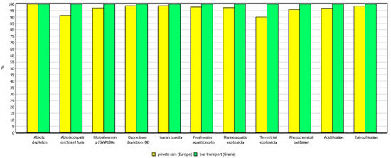 From the results obtained, there were no significant differences for the impact categories, with transportation by regular buses being slightly more impacting. The relative differences ranged between (0–10%) with ADP fossil fuels and TETP recording the most differences. The differences were due to the transport means since the same distance and number of workers were considered. LCA studies often do not take some important but indirect impacts such as transportation of workers into consideration. However, due to the high environmental impacts associated with daily transportation of workers, who are essential for the production of the chocolate, it was prudent to compare the different transport scenarios and suggest appropriate mitigation strategies. According to the emission inventory analysis, road transportation including private cars, trucks, and buses is the main contributor to local air pollution [39]. The activities of the transport industry release several million tons of gases each year into the atmosphere which contribute to global warming and stratospheric ozone layer depletion. These include lead (Pb), carbon monoxide (CO), carbon dioxide (CO2; not a pollutant), methane (CH4), nitrogen oxides (NOx), nitrous oxide (N2O), chlorofluorocarbons (CFCs), perfluorocarbons (PFCs), silicon tetraflouride (SF6), benzene and volatile components (BTX), heavy metals (zinc, chrome, copper and cadmium), and particulate matters (ash, dust) [40].