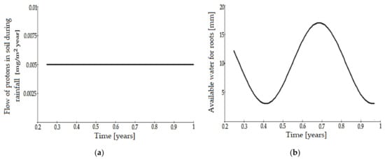 Source functions (environmental data) of process, obtained by interpolation of measured data: (a) Variation in time of protons flow in the soil, during rainfall; (b) Variation in time of water availabile to plant roots.