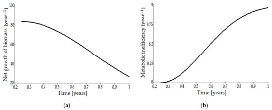 The behavior of the functions of species: (a) variation in time of net growth of biomass; (b) Variation in time of metabolic inefficiency.