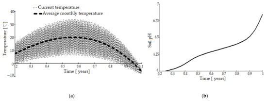 Variation in time of: (a) environment temperature; (b) soil pH.