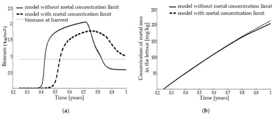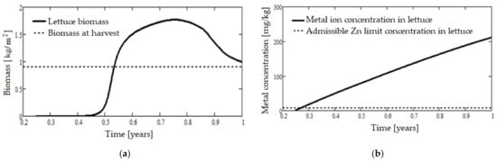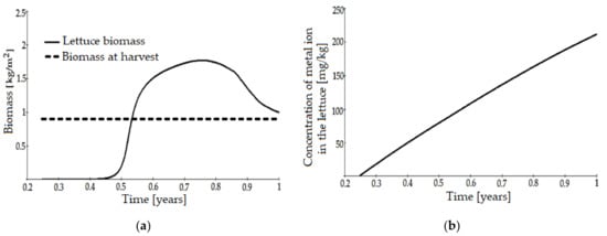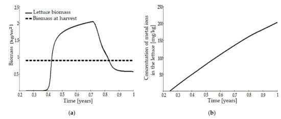 The two applications explained above are graphically represented In Figure 8. We work with an initial Zn concentration in the soil of 615 g/L, the value of the harvest mass of 0.9 kg and the value of 7.9 mg/kg of the permissible limit concentration of zinc in lettuce. The optimal harvesting time, if zinc pollution is not taken into account, results from the intersection of the biomass evolution curve with the horizontal line which represents the optimal mass (from the point of view of food) at harvesting (Figure 8a). The time with the value of 0.5 years is obtained which, taking into account that the lettuce culture begins the evolution at the time of 0.25 years, means a duration of approximately 15 weeks until the harvest.