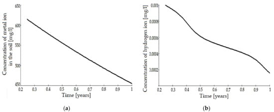 Time dependence of: (a) metal ions concentration in the soil; (b) hydrogen ions in the soil.