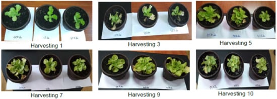 Similar curves of bioaccumulation phenomena are presented in study [], and similar experimental curves of lettuce mass growth are found in []. The similarity is valid only in the time interval limited by the time of harvest. A visual result of model validation by the subsequent experiments that we have conducted is presented in Figure 9, where we used three zinc concentrations for each group of lettuce plants: 1.5%, 3% and 4.5%.