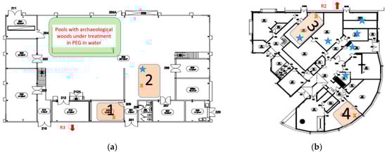 (a) Description of the first building; (b) Description of the second building. Locations of archeological wood are indicated by blue stars. The brown squares and the brown crosses indicated the room selected for the monitoring and the locations of sensors in these rooms.