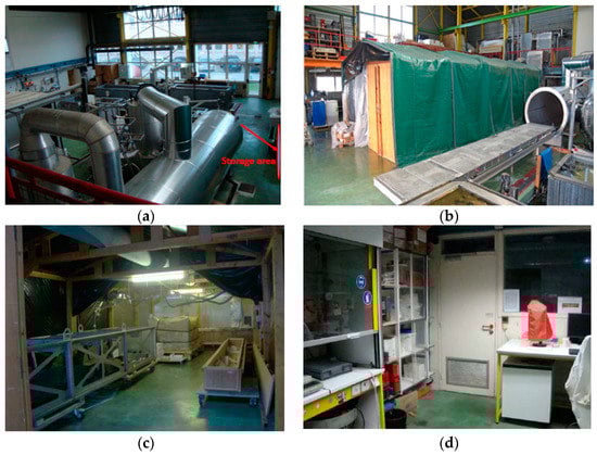 Figure 3 display pictures of the spaces under monitoring in the second building. This latter concentrates the majority of restoration workshops and storage of archeological and historical collections. The archaeological storage area (space 3) is depicted in Figure 3a and stores wooden after their resin/drying treatment. Some integrated metal in very small proportion was also there. The wood comes from boats at different historical periods, from Romans to Modern. The HVAC keeps the temperature and relative humidity constant at 22 °C and 45% RH.