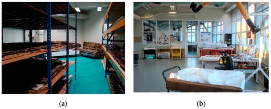 (a) Storage room for archeological woods (space 3); (b) Sculpture restoration workshops (space 4).