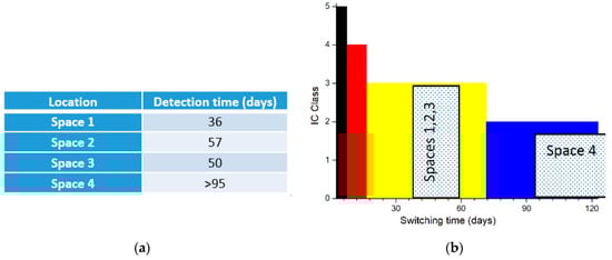 (a) Reporting of the detection time for the sensitive tag for the different areas under monitoring; (b) IC class for the different spaces.
