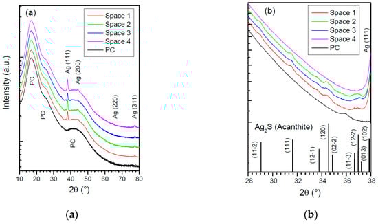 (a) XRD diffractograms of exposed silver samples and polycarbonate substrate; (b) XRD patterns between 28° and 38°.