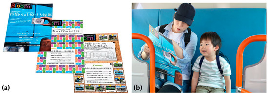MM in this study was not an experiment, but a transport policy. In order to encourage people to change their attitudes and behaviours, the quality of the MM communication tools is very important. In order to guarantee this quality, a review committee was formed to create the LITNs consisting of city authorities, special advisors, creative directors, and designers. The committee used the KJ method to define the core brand message and thus, “Living in Oyama, Bus in your life.” was created. Efforts were made to ensure that this core brand message was communicated to the public through the LITNs. The committee spent approximately 30 h discussing the plan, design, and articles for the conception of the LITNs. A sample of the articles is shown in Figure 1, and the contents of the LITNs in Table 2. The articles in the LITNs had the following characteristics, based on the knowledge of MM, to reach people psychologically, and to encourage them to change their spontaneous travel behaviour. A part of it is shown in Figure 2, Figure 3 and Figure 4.