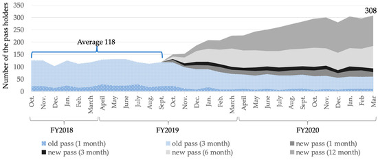 As of 31 March 2021, 807 new passes were sold. The number of new pass holders continues to increase despite the COVID-19 disaster. Compared to the average number of old pass holders, which was about 118, the number of new pass holders was 308 as of March 2021, an increase of about 2.6 times (see Figure 5). Of the 301 people who had purchased the new pass as of November 2020 (this was the time point due to data limitations), 44 pass holders (15%) were transferred from the old pass, while the remaining 257 (85%) were new purchasers.