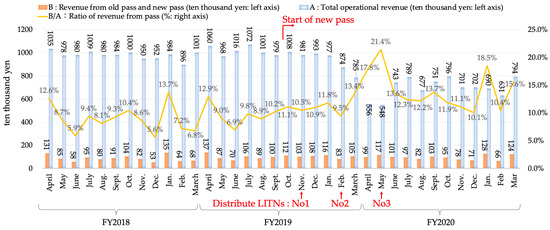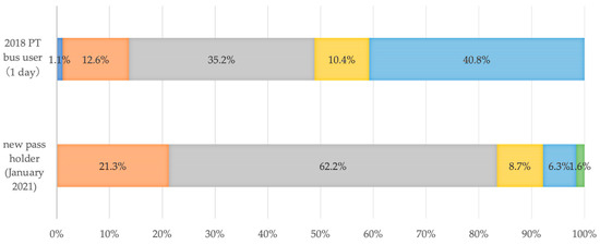 Based on the questionnaire responses from the new pass holders (n = 127), the average number of times the bus was used per month is depicted at three time points (see the left-most of Figure 12). Owing to the t-test for the number of times the new pass holders used the bus between the three time points, the t-value (two-tailed) = 1.98 indicating a significant difference. This indicated that the number of times the new pass holders used the bus was higher after the purchase than before the purchase (increased by 1.16 times), and that the number of times might have decreased due to the effect of COVID-19. It should be noted that the April 2020/February 2019 ratio of the actual number of users of city buses as a whole was 53%, while the same ratio for new pass holders based on the questionnaire survey was 80%. The reason for this difference could be explained by the fact that the new pass holders in April 2020 might be those who had to use the bus daily, even under the influence of COVID-19. However, about 70% of the 158 new pass holders as of April 2020 (108 people) purchased a new pass before February 2020 (before the impact of COVID-19). Therefore, the possession of the new pass might discourage people from refraining from using buses under the influence of COVID-19.