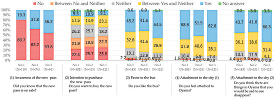 The proportion of respondents who answered “Yes” for preferring attachment to the city (2) (see Figure 14, far left) increased by 16.6% from No. 1 to No. 3.