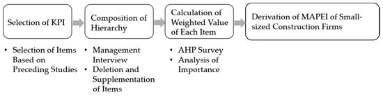 We selected the items used to evaluate performance (Figure 2) and deleted and supplemented items through expert interviews to configure the hierarchy. The survey was performed based on the hierarchy and the weighted values were tabulated by analyzing the importance of each item to derive the MAPEIs of small construction firms.