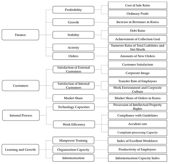 Construction firms have many factors to consider when measuring performance due to the uncertainties in the market environment. Therefore, the current study applied a Balance Scorecard (BSC). A BSC consists of four areas—finances, customers, internal processes, and learning/growth—and is applied to the management control of firms in good standing in Korea and abroad [19]. The BSC of construction firms is the same as that of other companies, but performance and KPIs differ due to corporate characteristics. Management characteristics also vary according to the size of corporations, even if they are in the same industry. Therefore, the current study considered the characteristics of small construction firms to develop the hierarchy of MAPEIs. KPIs were derived by analyzing the characteristics of small construction firms, and all items for performance evaluation had weighted values. MAPEIs serve as KPIs to measure the management performance of small construction firms.