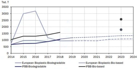 It can be shown that there are substantial variations in the historical values and predictive values of both organizations. Both studies take on different rates of development. The 2019 IFBB predictions score considerably higher than those of European bioplastics [44]. For biodegradable plastics, the increase of production capacities between 2018 and 2023 is 23.31%, and for bio-based plastics, it has a growth of 15.85% on average [2,5]. For bio-based and biodegradable plastics, the overall growth figures for IFBB [44] in 2023 were 72.80% compared with 2018 and 62.43%, respectively. The IFBB [44] estimates 1.8 million tons of biomass-based plastics production and 2.6 million tons of bio-based plastics for 2023. In contrast, European Bioplastics estimates for biodegradable plastics are 1.3 million metric tons, and for organic plastic, 1.1 million metric tons. The increased production potential of biodegradable plastics relative to bio-based plastics has been attributed by European Bioplastics [3], mainly to substantial growth rates of polyhydroxyalcanoates (PHA).